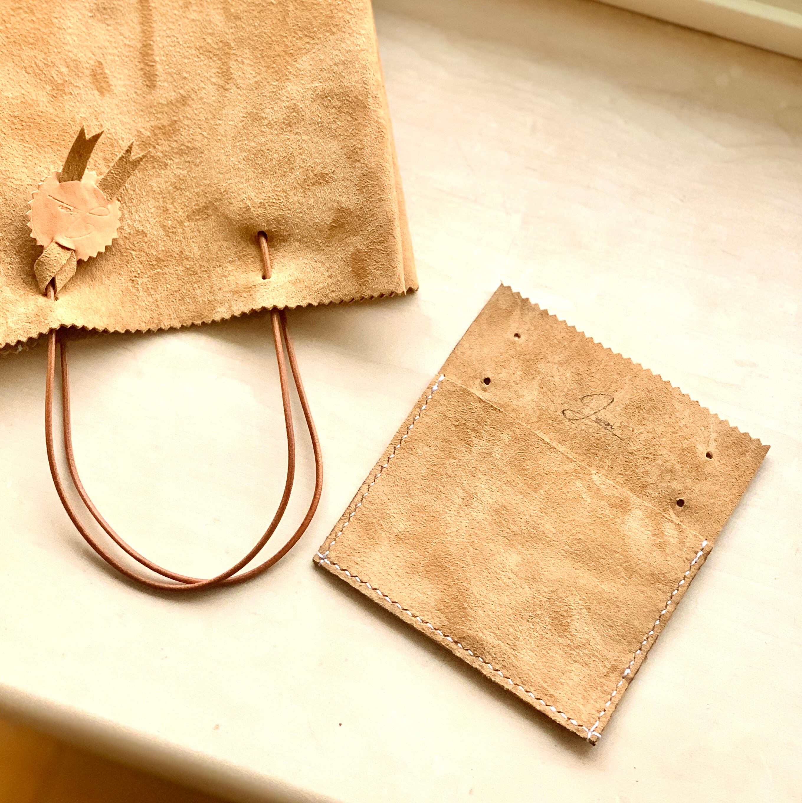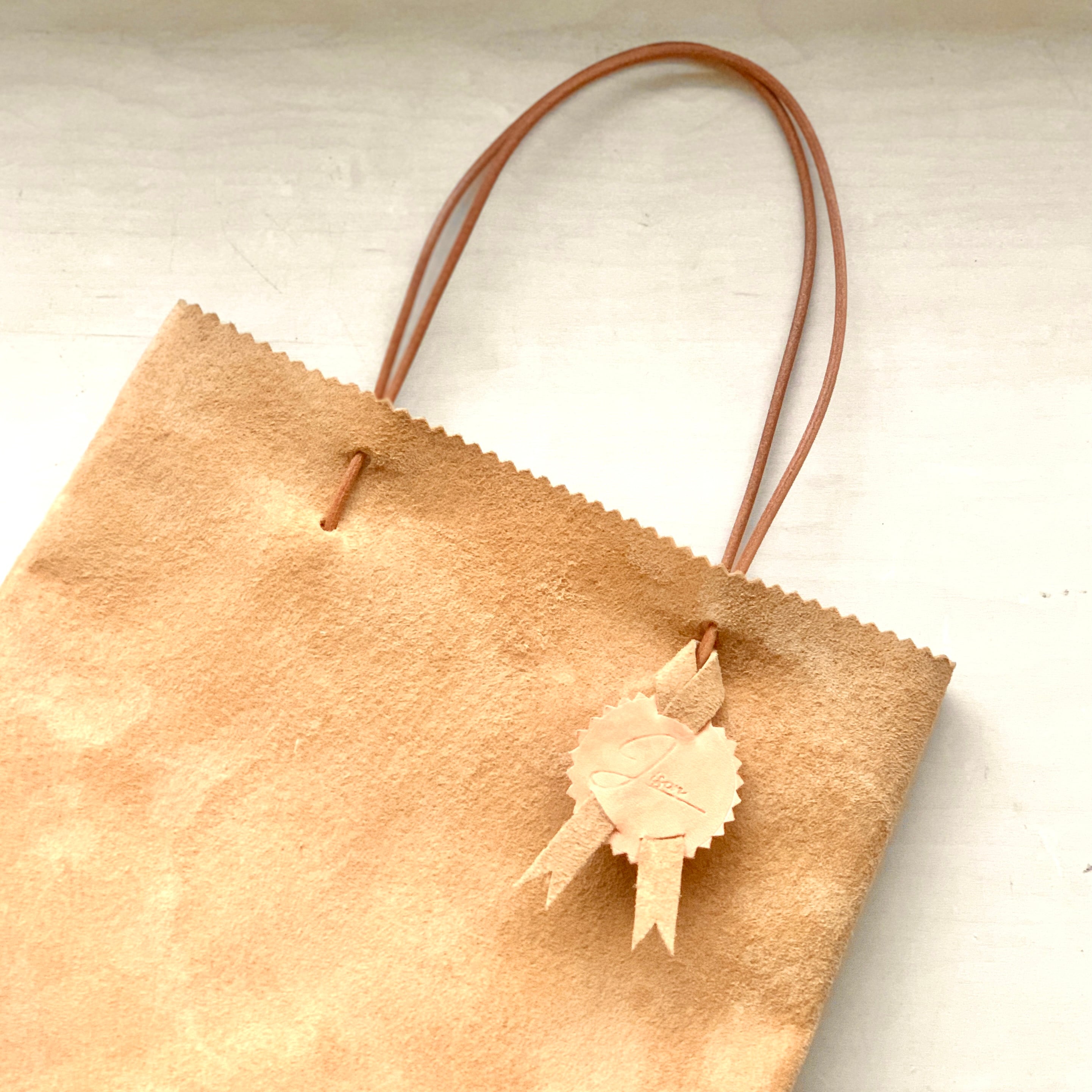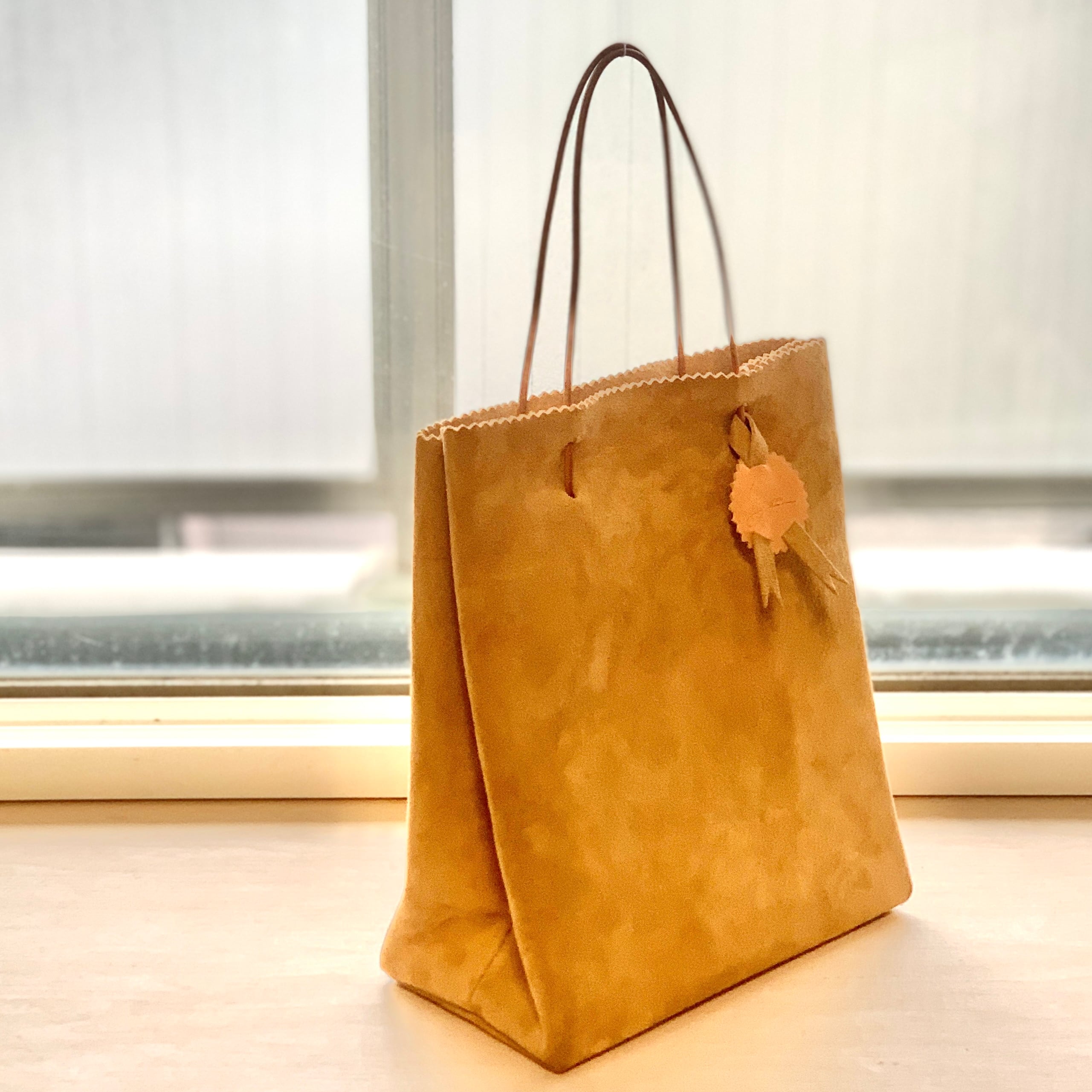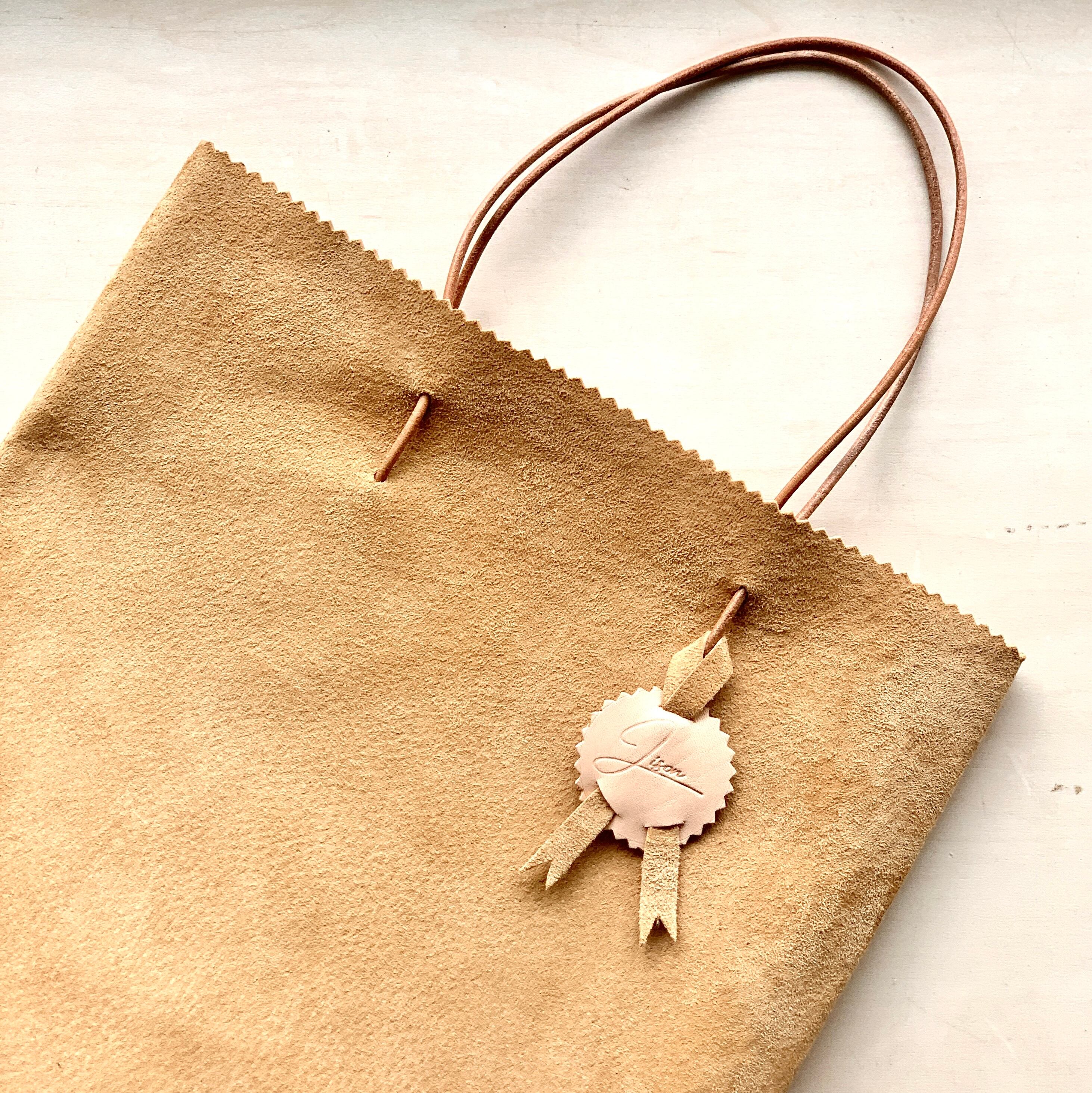 紙袋のような見た目のスエード革製手提げバッグ。