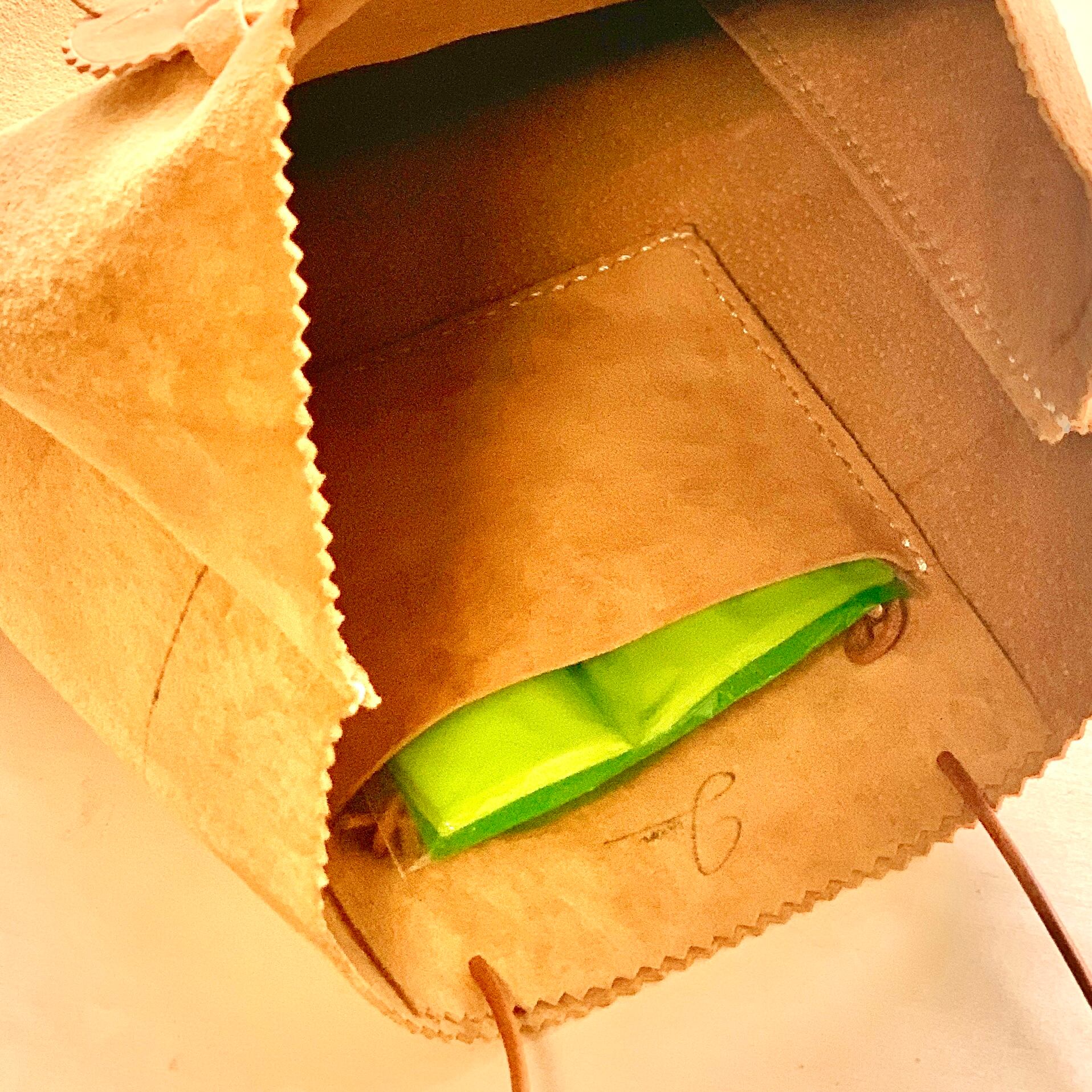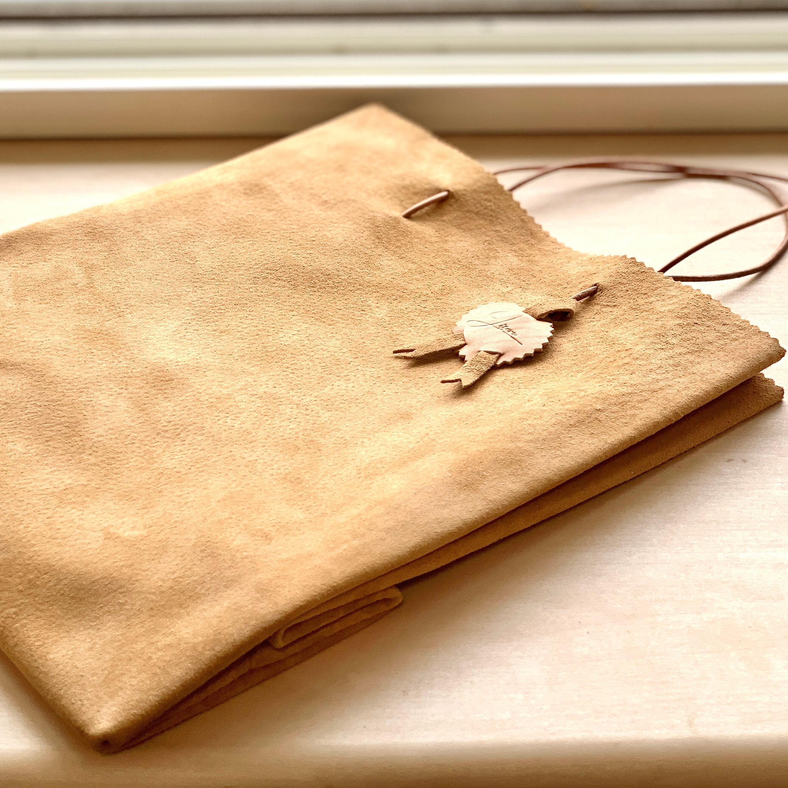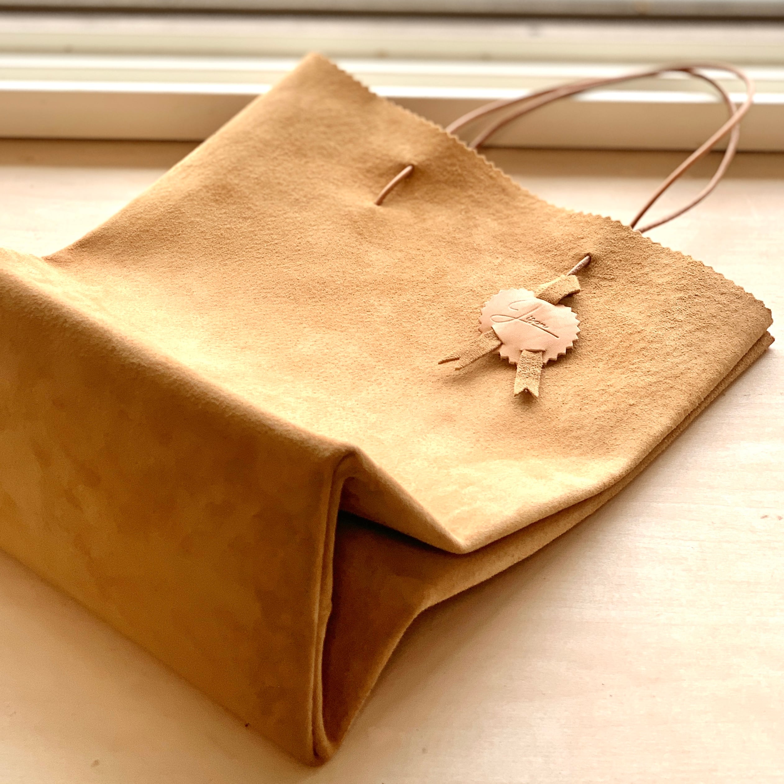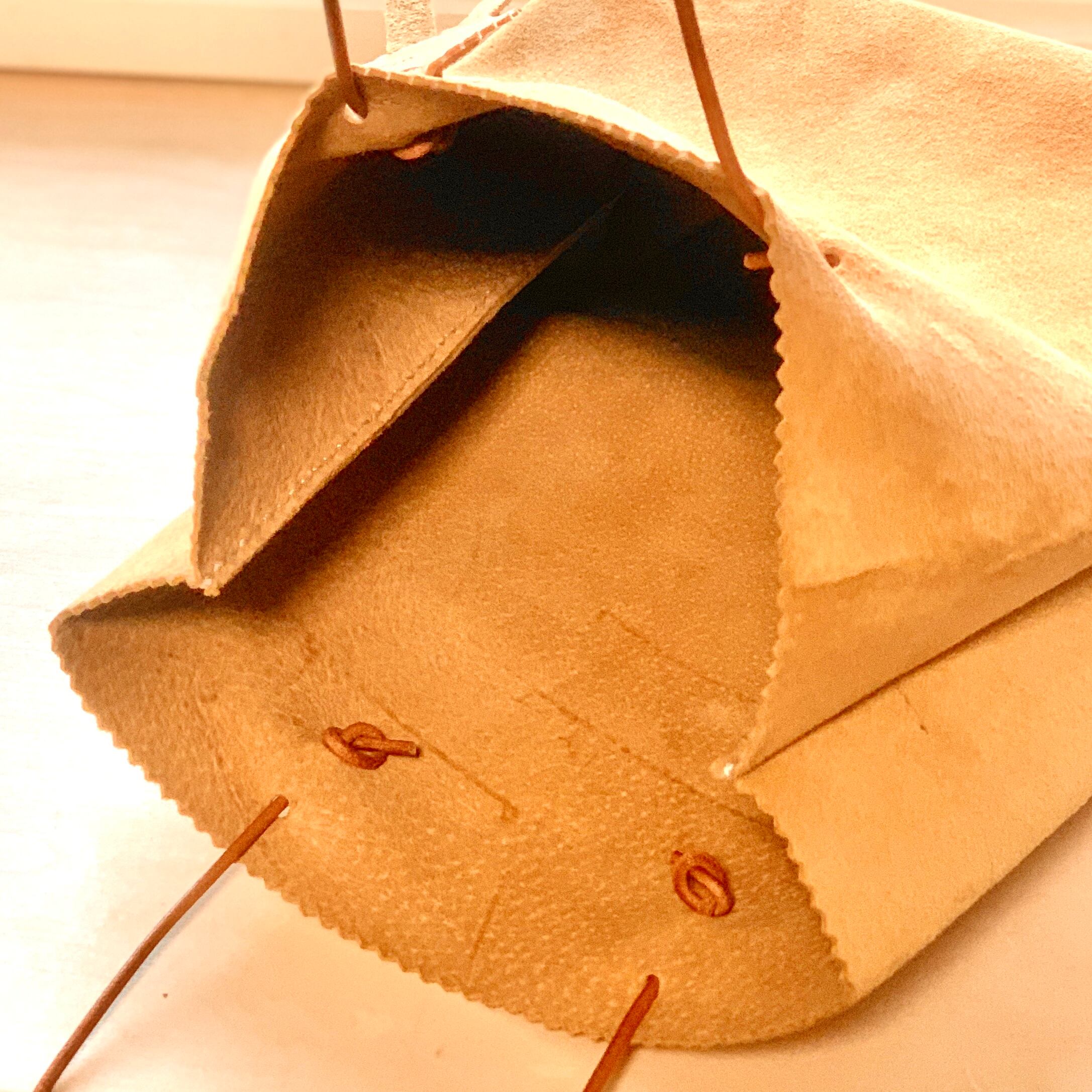 紙袋のような見た目のスエード革製手提げバッグ。